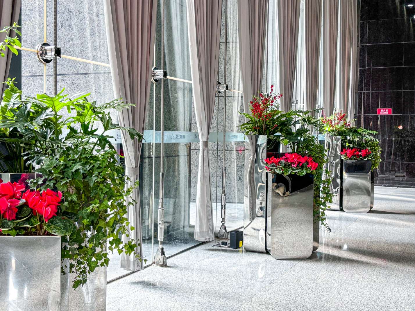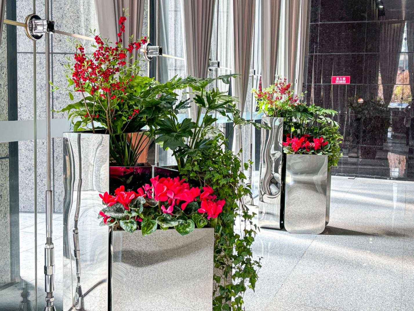 這組位于寫字樓大廳的植物組合盆栽,整體布局優(yōu)雅、富有層次感。1. 盆器材質(zhì):花盆采用高光不銹鋼材質(zhì),表面光滑且具有鏡面效果,…